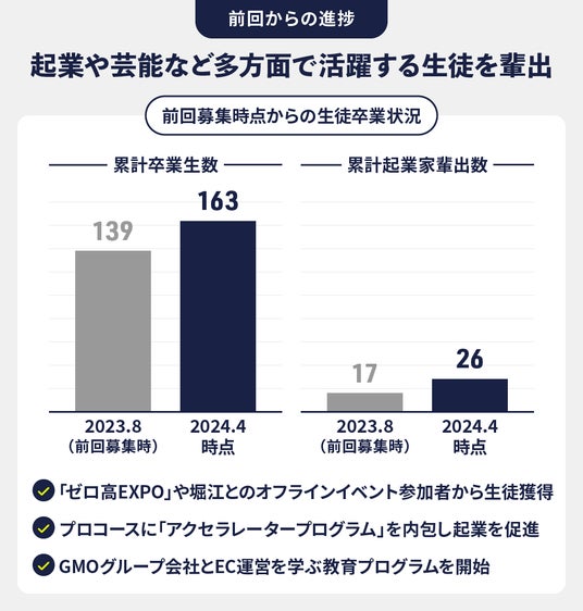 「起業するならゼロ高」という一貫したブランディングが浸透し、在学中、また卒業後に起業する生徒をこの2年間で多数輩出することができました。