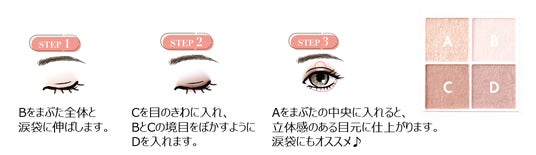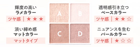 各色右下部分にほんのりニュアンスを生むカラーをセットしており、使うだけで簡単に目元の印象が変化します。