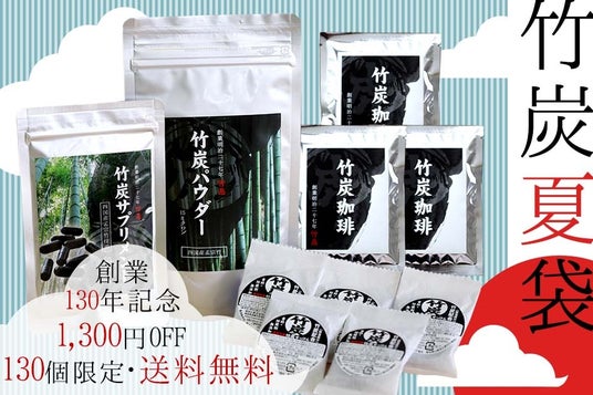 創業明治27年(1894年)より竹材・竹製品製造卸業として皆様にご愛顧いただいている竹材専業メーカーである、虎斑竹専門店 竹虎(運営:株式会社山岸竹材店)は、創業130周年を迎えるにあたり、皆様への感謝の気持ちを込めて、超特価1,300円OFFの竹炭夏袋を販売します。四国産の孟宗竹を使用した高品質な人気竹炭製品4種を詰め合わせた特別セットとなっており、暑い夏の健康と美容をサポートします。数量限定130個となりますので、お早めのご購入をお勧めいたします。