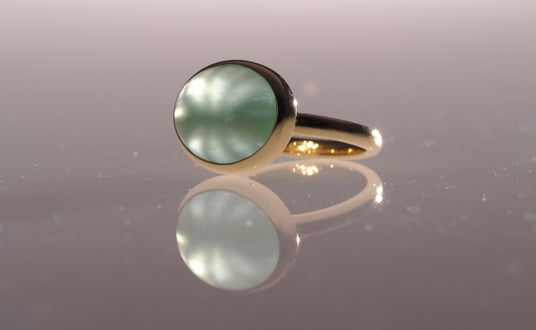 糸魚川翡翠の中でも色が美しく透明度が高い、貴重性の高い「ろうかん石」を用い、その透明度を活かして、「菊」に見立てた座金を「覗く」ようにしたリングです。