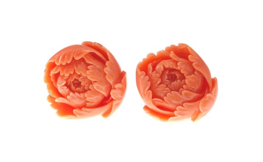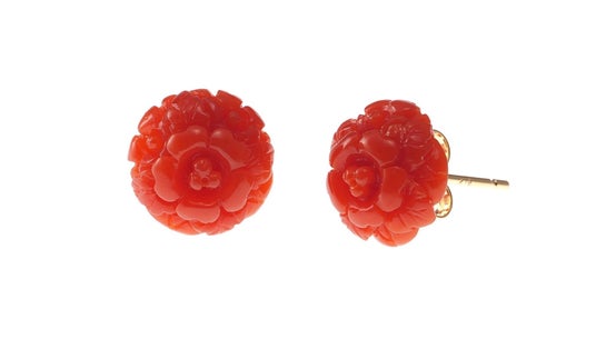 厚みのある高知県産桃珊瑚を使用し花びら一枚一枚を深く掘ることにより花びらの陰影を表現、花開く牡丹の美しさを表現したピアスです。