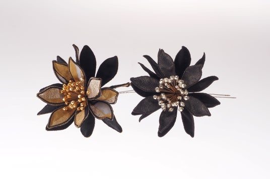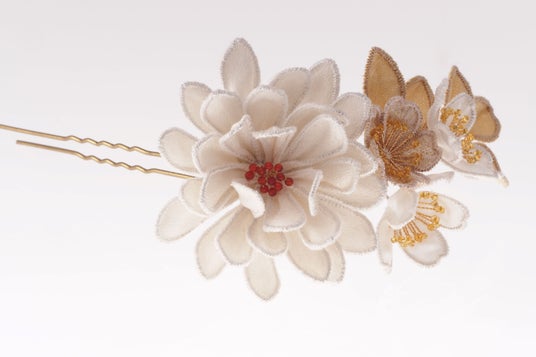 白い正絹生地と西陣織を使い、日本の国花である菊と桜のかんざしを制作しました。