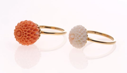 高知県の花彫職人に依頼し、特に高い技術力が問われる「菊彫り」の珊瑚を使用。土台には昔、帯留めによく使われていた「菊透かし」をいれてリングにしました。