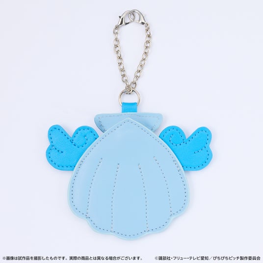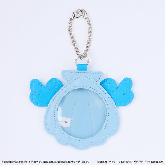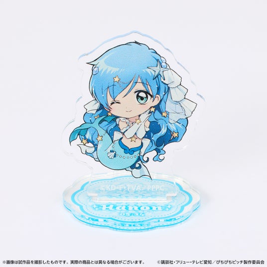 波音をイメージしたフリルハンドバッグ、アクアピッチをイメージした缶バッジチャーム、ミニキャライラストを使用したアクリルスタンドをセットにしました。