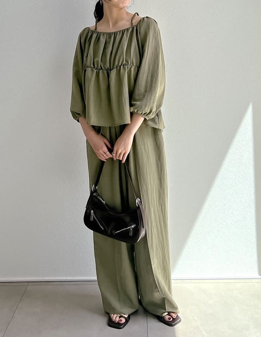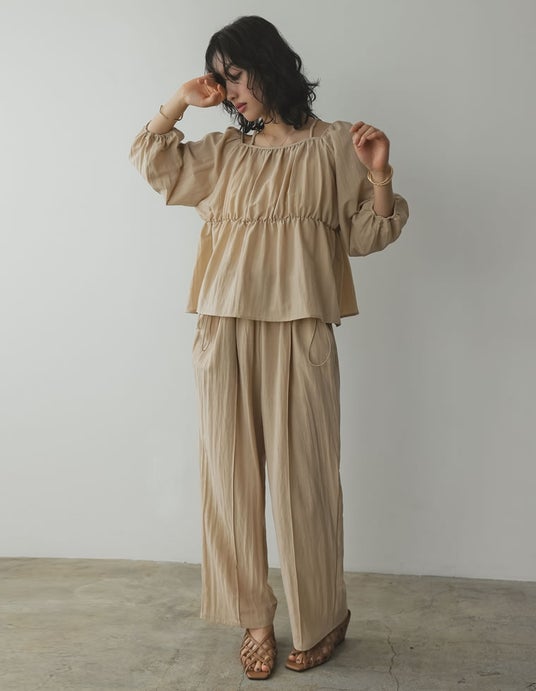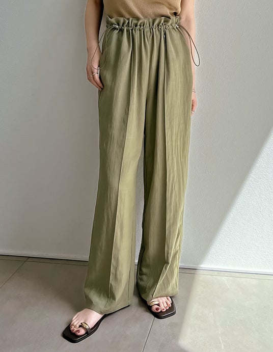 ウエストがくしゅっとしたデザインデザインで、シンプルなトップスと合わせてもこなれた印象に。