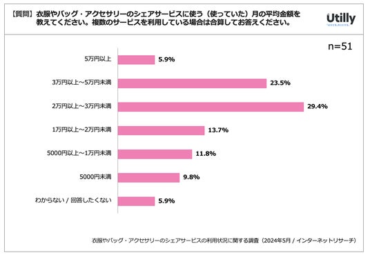 衣服やバッグ・アクセサリーのシェアサービスに使う月の平均利用金額は2万円以上3万円未満が29.4%だった。全体として3万円未満と回答した割合が58.8%であった。