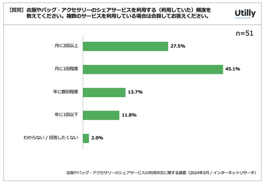 衣服やバッグ・アクセサリーのシェアサービスの利用頻度については月に1回程度が45.1%でボリュームゾーンとなった。次いでは、月に2回以上が27.5%であった。