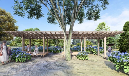 コンクリートを使用しない木製基礎(土中30年耐腐朽の超高耐久木材)で新設する東屋(完成イメージ)。その他にも木製基礎のデッキテラスや展望台も新設予定。