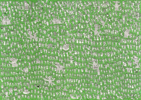 彼が真っ白いキャンバスに表現するのは、0.03から0.7mmまでのペンで描く唯一無二の個性豊かなキャラクター達。それぞれ表情や格好が違い、画面の中で踊っているように表現される。