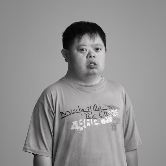 現在はグループホームに所属しており、作品の多くは以前の施設に入所していたときに描かれたもの。その時思い描いたモチーフを表現することが多く、画用紙や数字練習ノートに敷き詰められるように書かれた「りんご」は、本人にタイトルを尋ねると「すいか」と答える日もある。趣味は映画を見ること。音楽を聴くこと。