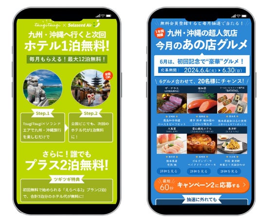 2024年6月4日(火)から2025年5月31日(土)までの期間は、ソラシドエア便を利用して九州・沖縄エリアを訪れ、「TsugiTsugi」を利用して対象施設に宿泊いただいた全ユーザーに、全国の「TsugiTsugi」対象施設で利用可能な宿泊権を最大で12泊分プレゼントします。