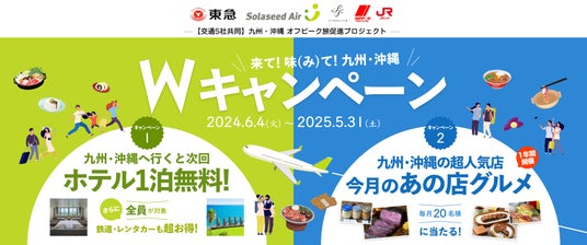 東急株式会社(以下、東急)が提供する定額制回遊型宿泊サービス「TsugiTsugi」(ツギツギ)(以下、「TsugiTsugi」)と株式会社ソラシドエア(以下、ソラシドエア)、株式会社スターフライヤー(以下、スターフライヤー)、九州旅客鉄道株式会社(以下、JR九州)、ニッポンレンタカーサービス株式会社(以下、ニッポンレンタカー)は、混雑のない快適で満足度の高いオフピーク旅の需要創出および関係人口の拡大、移動促進による九州・沖縄エリアの地域活性化を目的とした「九州・沖縄 オフピーク旅促進プロジェクト」(以下、本プロジェクト)を5社共同にて、本日2024年6月4日(火)より始動します。東急は2021年より、全国200以上の宿泊施設※1から、その日の都合や気分に合わせてお好きな場所を選び、定額で宿泊できるサービス「TsugiTsugi」を提供しています。1泊単位の宿泊よりも大幅にお得に宿泊できる料金体系と多様な宿泊施設ネットワークの構築により、宿泊施設やその周辺地域に新たな旅の需要を創出し、平日や閑散期であっても「TsugiTsugi」ユーザーが全国を周遊することでオフピーク送客による宿泊施設の未稼働客室の活用促進と、地域経済の活性化、観光需要の平準化を後押ししてきました。今般開始する本プロジェクトでは、2024年6月4日(火)から2025年5月31日(土)までの期間にソラシドエア便を利用して九州・沖縄エリアを訪れ、「TsugiTsugi」を利用して対象施設に宿泊いただいた全ユーザーに、全国の対象施設で利用可能な1泊分の無料宿泊権を最大で12泊分※2プレゼントします。これにより、九州・沖縄エリアへの移動を促進し、さらにソラシドエア機内、スターフライヤー機内限定価格で販売するJR九州の「JR九州フリーきっぷ」と、「TsugiTsugi」ユーザーへ優待価格でニッポンレンタカーのサービスを提供することで、より気軽な域内移動を可能とし、地域経済の活性化に取り組みます。加えて、「TsugiTsugi」の無料会員※3を対象に、九州・沖縄エリアに実在する「行ってみたくなる」“あの”名店の逸品グルメが毎月当たるプレゼントキャンペーン※4を同時に実施し、九州・沖縄エリアへの旅のきっかけづくりを行います。昨今の観光需要の急速な回復にともない、観光地が賑わいを取り戻している一方で、社会問題となっているオーバーツーリズムにより、地域住民の生活への影響だけでなく、「場所」と「時」の一極集中に伴う過度な混雑で旅行者の満足度が低下し、地域への再来訪や関係人口拡大のきっかけを失ってしまうことも懸念されています。