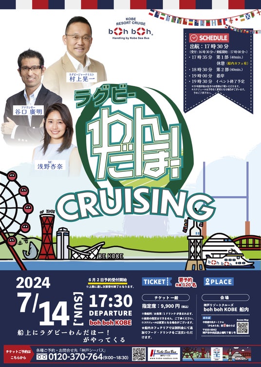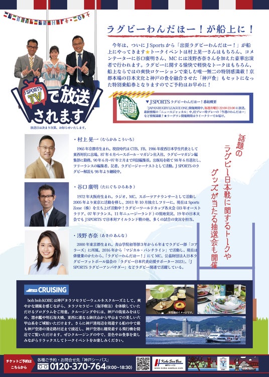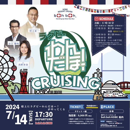 2022 年より JAPAN RUGBY LEAGUE ONE 開催期間中、毎週月曜に放送されてきた「ラグビーわんだほー!」が、番組開始以来初となる船上での単独イベントを開催。レギュラーMC陣が、いつものスタジオを飛び出して、遥々神戸の船上 boh boh KOBE までやってきます。番組の顔であるMC浅野杏奈さん、コメンテーター谷口廣明さん、そして神戸シーバスが 2023 年より毎年開催している「ラグビー愛クルーズ」でもMCを務める村上晃一さんを迎え、潮風を感じられる非日常なロケーションで生トークライヴをお楽しみいただけるクルージングとのコラボレーションイベントです★ さらに、弊社早駒運輸が全面支援を行う神戸の女子ラグビークラブチーム「神戸ファストジャイロ」選手も特別出演します!