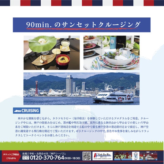 船から見える神戸の景色とリゾート気分を味わいながら、御三方の軽快なトークとお料理をお楽しみください。先着での受付となっていますので、ぜひお早めにご予約ください。