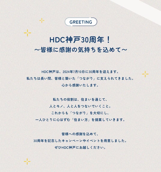 30周年のメインテーマは「つながり」。HDC神戸は長い間、皆様と築いた「つながり」に支えられてきました。HDC神戸の役割は、住まいを通じて、人とモノ、人と人をつないでいくこと。これからも「つながり」を大切にし、一人ひとりに心はずむ「住まい方」を提案していきます。「つながり」をテーマに30周年を記念したキャンペーンやイベントを用意しました。