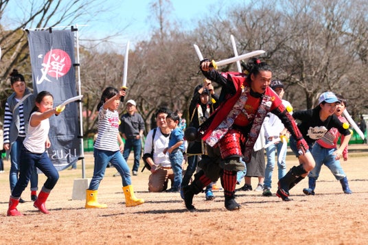 チャンバラ合戦は柔らかいスポンジ刀で敵の腕についているボールを狙い落とすゲームです。25対25の軍に分かれて全滅戦や大将戦のルールで行います。参加無料、5歳以上であれば老若男女問わず参加できます。