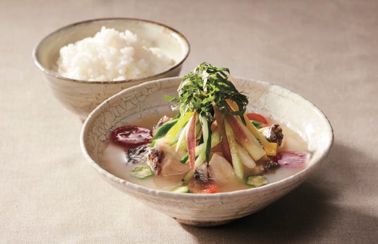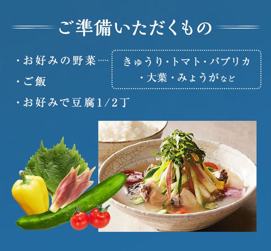 しょうがの風味を感じるスッキリとした冷たい鯛だしに、キュウリ、トマト、オクラなどお好みの野菜を加えるだけでサッと完成。暑い夏場でも火を使わず手軽に調理できます。お好みでミョウガ、大葉などの薬味を足すと爽やかな香りや食感を感じられ食欲をそそります。