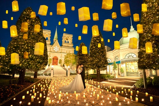 披露宴のお開き後にご新郎ご新婦とゲストがチャペル広場に集まり、BGMに合わせてバルーンランタンをリリースします。パーティのフィナーレにふさわしい幻想的な空間での記念撮影が叶います。フォトウェディングでも注文可能