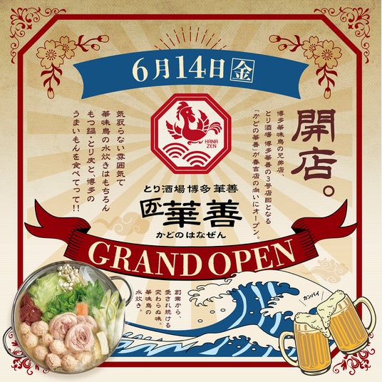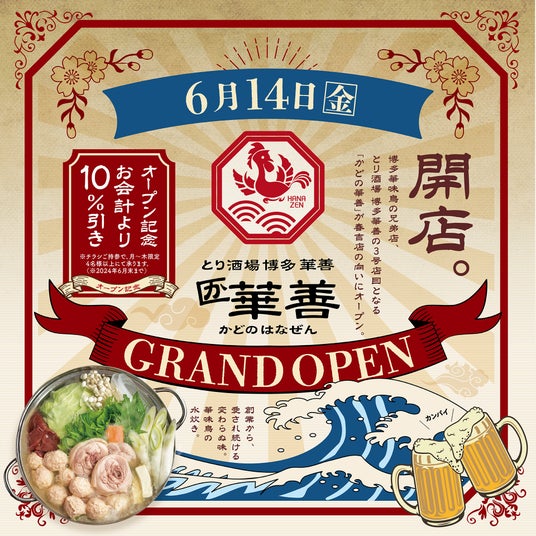 トリゼンダイニング株式会社(本社:福岡市博多区/代表取締役社長:河津 善博)は、2024年6月14日(金)に系列店としては3号店目となる「とり酒場 博多華善 かどの華善」(とりさかば はなぜん かどのはなぜん)を福岡県福岡市中央区西中洲にオープンいたします。