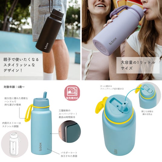 高品質なステンレスを使用した三層断熱構造のボトルで、最長46時間冷たさをキープできます。フリップトップ式の飲み口で蓋の開け閉めの手間がなくさっと飲むことができます。飲み口を閉じた際には漏れにくく、柔軟で耐久性のあるキャリーハンドルがついているのでお出かけにおすすめのドリンクボトルです。