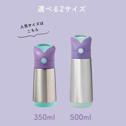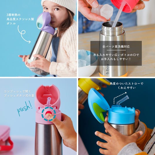 3層断熱の高品質なステンレスを使用し、長時間の保冷も保温もできる水筒です。サイズは350mlと500mlの2種類。500mlの水筒では冷たいものは最長15時間、あたたかいものは最長8時間温度を保つことができます。ボタン式の蓋で子供でも開け閉めが簡単。いつでも水分補給がしやすい、直飲みタイプのストロー付き水筒です。保育園・幼稚園や小学校でも使えて、女の子・男の子向けに、カラーも豊富でおしゃれなデザインを揃えています。