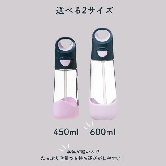 選べるサイズは450mlと600mlの2サイズ。大容量で、中身の見える水筒は、おでかけの際の水分補給に便利です。