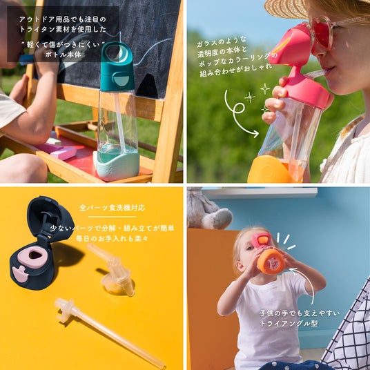 ワンプッシュで開く持ち手付きの蓋は、開け閉めが簡単。中のストローには角度がついていて、くわえやすく、飲みやすくなっています。シンプルなデザインで子供たちだけでなく、親子でも使っていただけます。