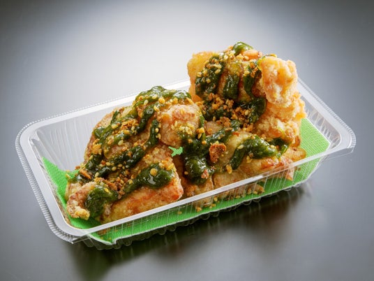 ニラを贅沢に使用した深緑ソースに、サクサク食感が楽しいフリーズドライ醤油を振りかけた変わり種が今年も限定復活!