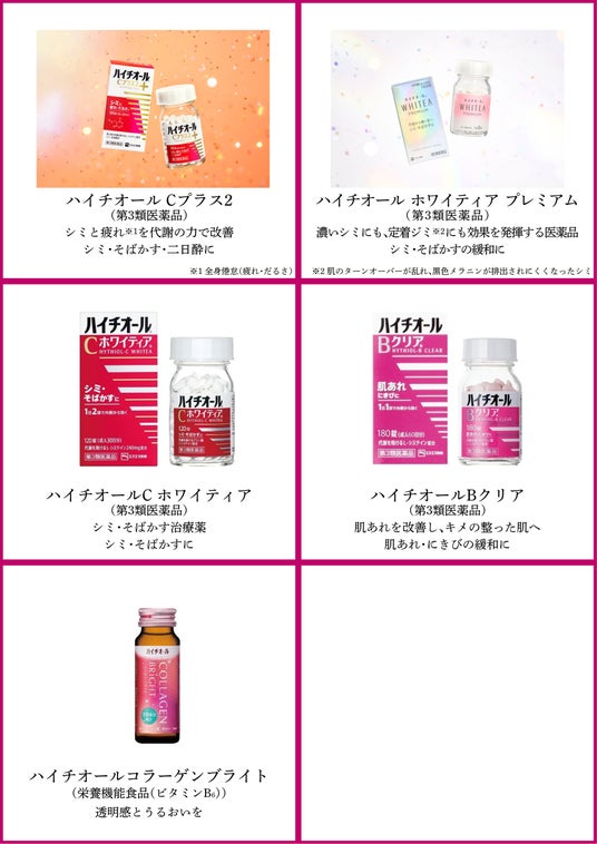 医薬品シリーズでは、シミ・疲れ※1・二日酔に効く「ハイチオールCプラス2」や、シミの原因メラニンに作用し、 濃いシミにも定着ジミ※2にも効果を発揮する「ハイチオール ホワイティア プレミアム」をはじめ、1点のシミもゆるしたくない※3方に向けた「ハイチオールCホワイティア」や肌あれ・にきびを改善し、キメの整った肌に導く「ハイチオールBクリア」をラインナップ。 また、栄養機能食品(ビタミンB6)として美容ドリンク「ハイチオール コラーゲンブライト」があります。