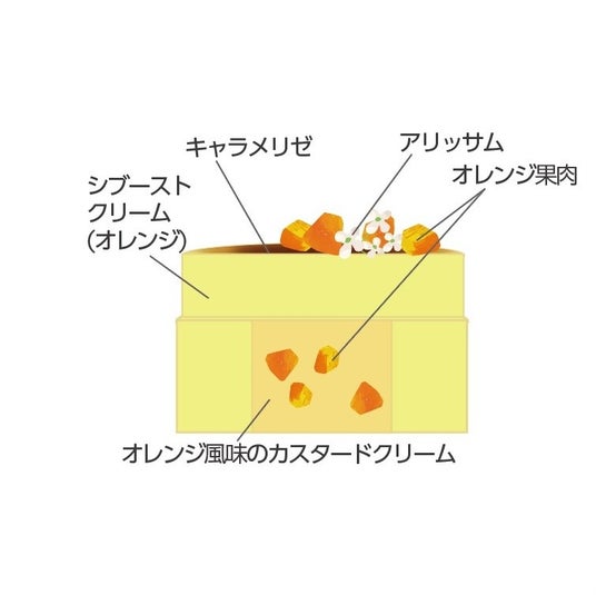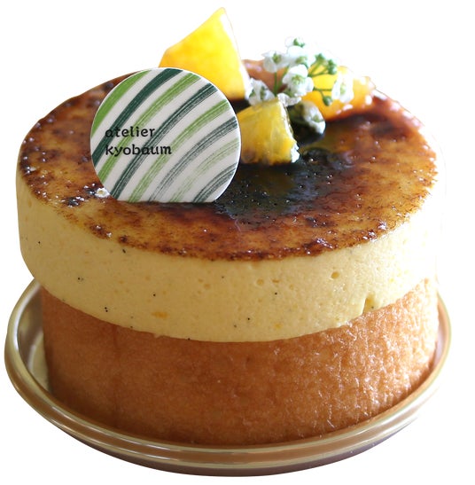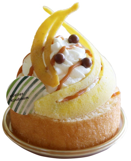 さわやかなオレンジ風味のカスタードクリーム、フレッシュオレンジの果肉とバームクーヘンの上には金柑と2種のオレンジのシブーストクリームを合わせました。キャラメリゼの香ばしさが味わいを深めます。