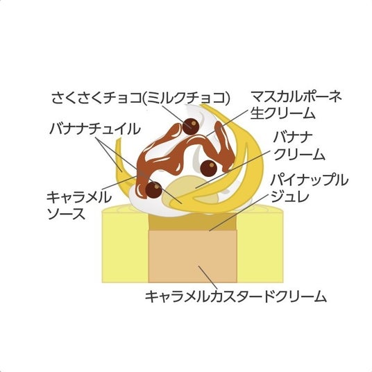 キャラメルカスタードクリーム、酸味がアクセントになったパイナップルジュレ、バームクーヘンの上に、バナナクリーム、マスカルポーネのシャンティとキャラメルソース、バナナをかたどったチュイルをトッピングしました。