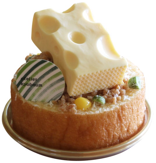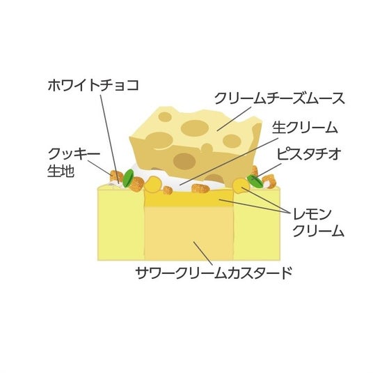 レモンクリーム、酸味のきいたサワークリームカスタードをバームクーヘンに詰め、糖衣がけしたピスタチオとシュトロイゼル(そぼろ状のクッキー)、インパクトのあるクリームチーズムースを乗せました。レアチーズケーキのような味わいをお楽しみいただけます。