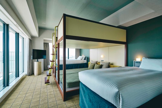2段ベッドがあり、最大4名で宿泊できるファミリーにおすすめの客室です。通常のベッドがあるスペースと、2段ベッドを隔てる位置にソファスペースがあるので、お子様が寝た後に翌日の支度をしたり、ゆったりお酒を飲んだりすることもできます。