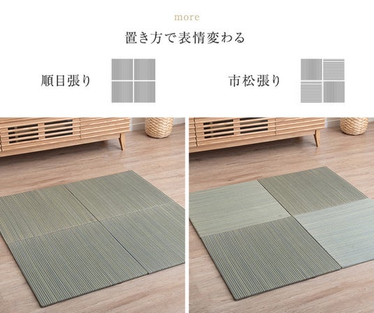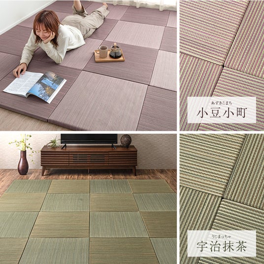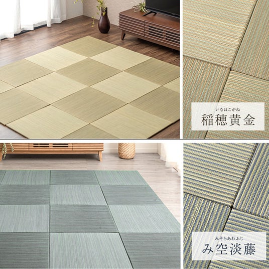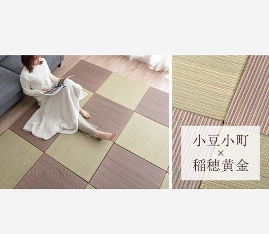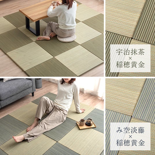 こちらの置き畳は【稲穂黄金】、【み空淡藤】、【小豆小町】、【宇治抹茶】の4色のカラーバリエーションを展開しており、カラーの組み合わせ方や畳の織り目の向きをアレンジすることでお部屋の印象をガラッと変えることができます。