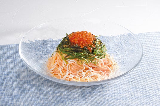 人気の明太子パスタにいくらと釜揚げしらすをトッピングした海の幸たっぷり贅沢パスタ。ぴりっと辛い明太子と大葉と海苔の豊かな風味が爽やかに広がります。