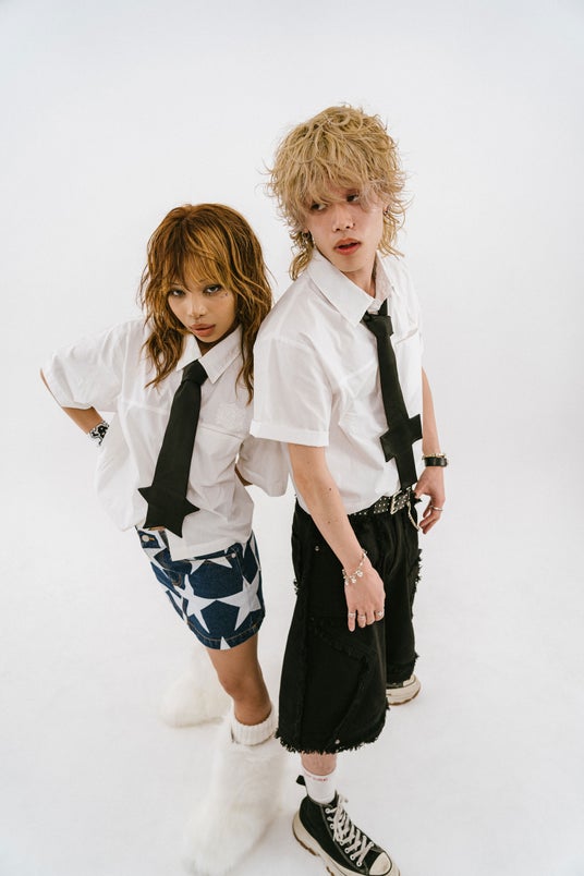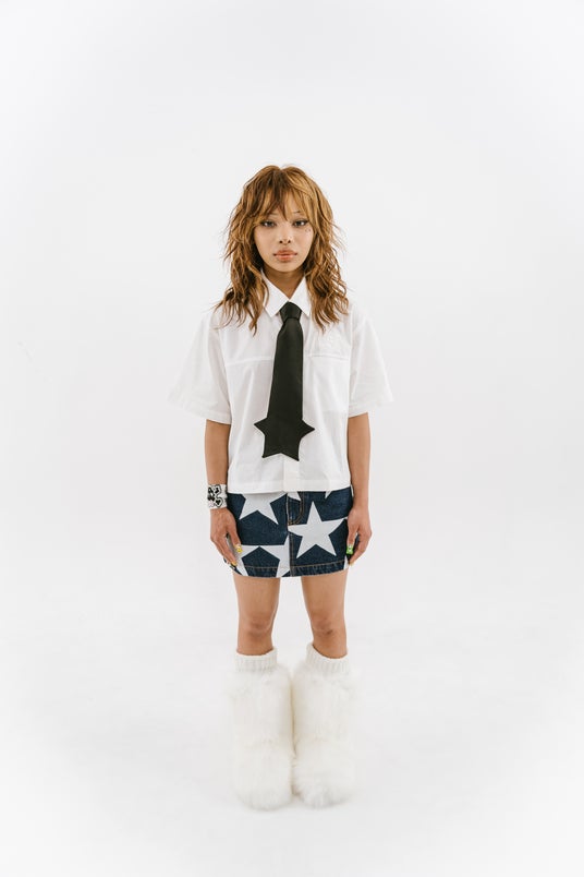 SKULL RED:SEVNS立ち上げのきっかけになったとも言える、この星型のネクタイ”Star tie”が僕らの中でキーアイテムとしてあったので、「ネクタイを着けるとなるとスーツではないけど、シャツの感じがいいから、スクール系とかどうかな?」という話になりました。