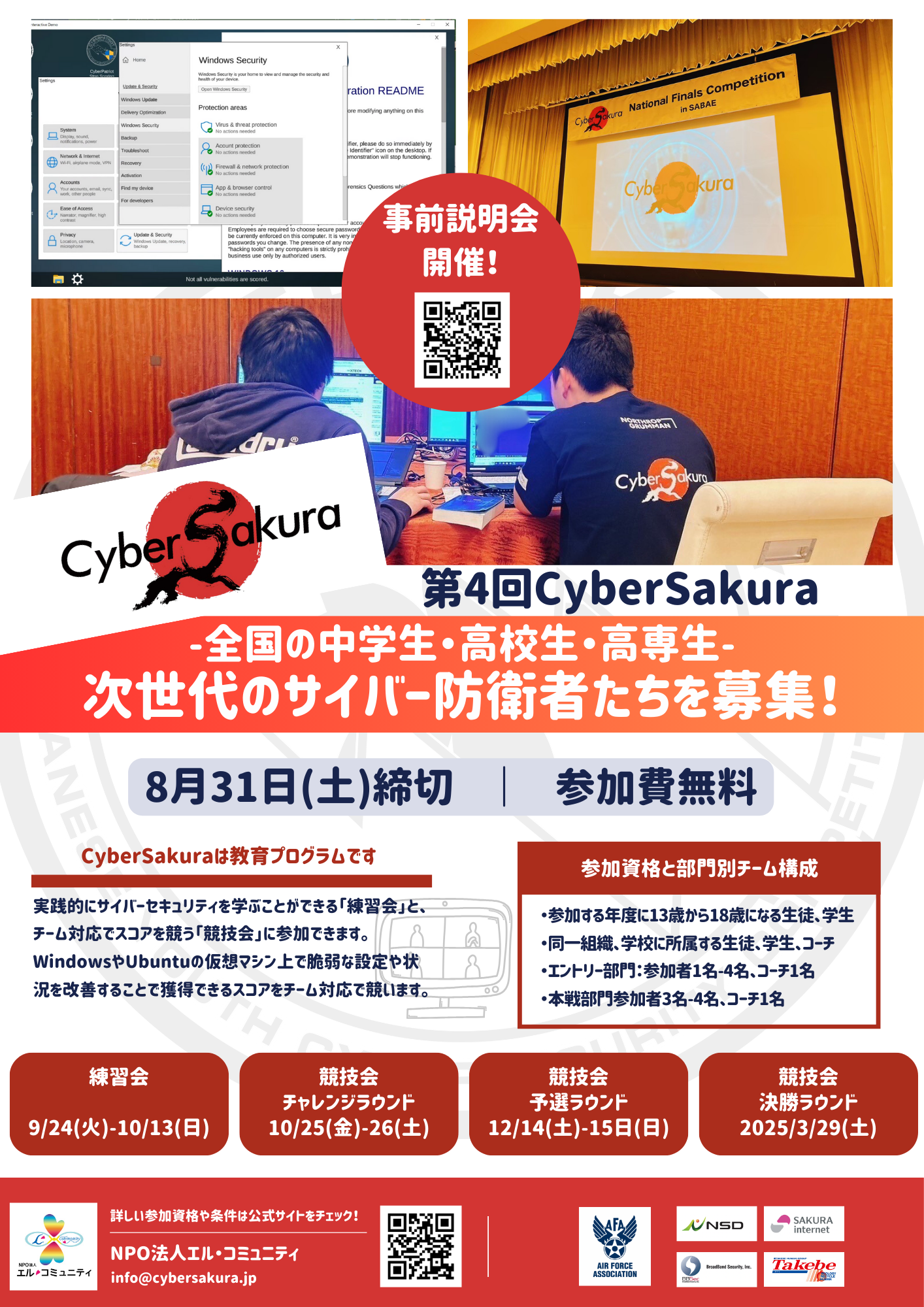 NPO法人エル・コミュニティ(所在地:福井県鯖江市、代表:竹部 美樹)は、日本の中高生を対象にしたサイバーセキュリティ教育プログラム「CyberSakura(サイバーサクラ)」の第4回の参加チームの募集を7月1日より開始しました。