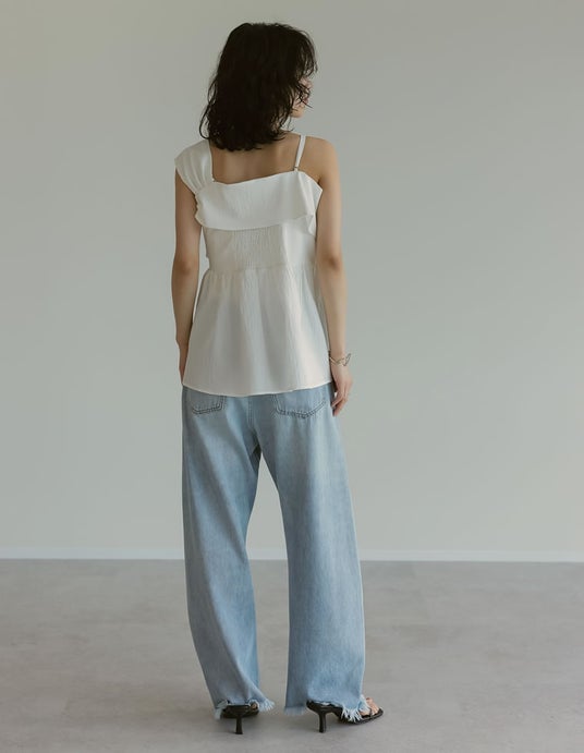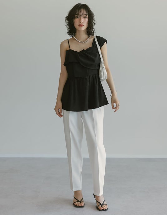 アシンメトリーなバランスでデザインされた肩紐が、モードな印象をプラスします。