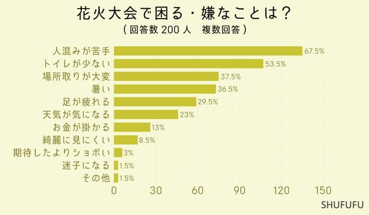 花火大会で困る・嫌なことを尋ねたところ、1位は「人混みが苦手(67.5%)」、2位「トイレが少ない(53.5%)」となりました。特に大きな花火大会だと100万人以上の人が参加することもあるので、トイレも行きたい時になかなか行き辛いですよね。