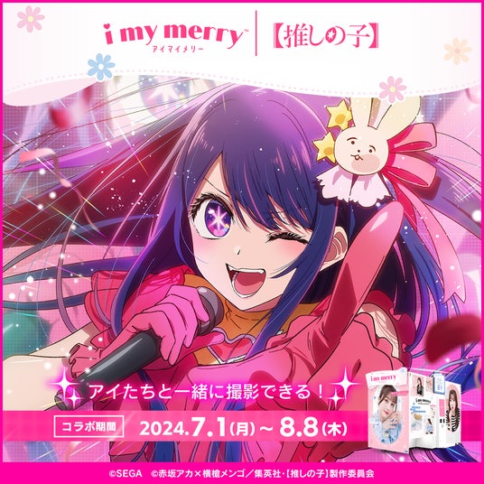 株式会社セガ フェイブ(本社:東京都品川区、代表取締役社長COO:杉野行雄、以下 セガ フェイブ)は、好評稼働中のプリクラ機『i my merry(アイマイメリー)』にて、『【推しの子】(おしのこ)』と2024年7月1日(月)よりコラボイベントを開催いたします。