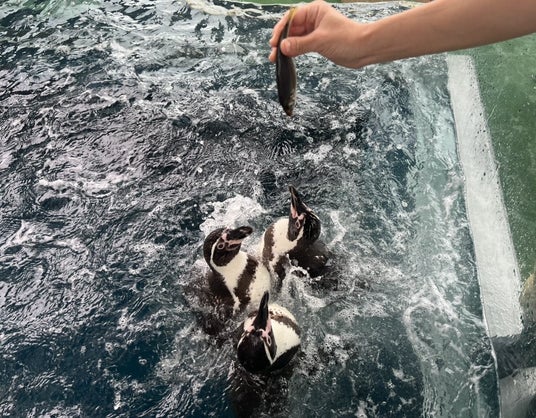 飼育員がペンギンに餌やりをしている時の様子