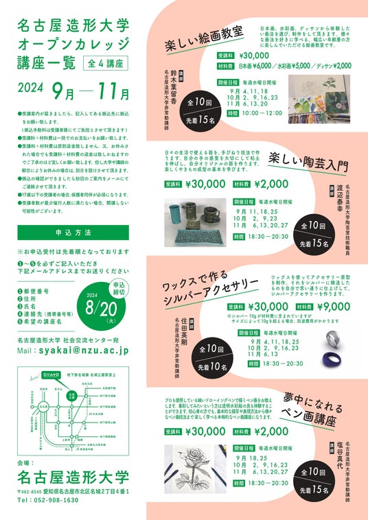 2024年度 名古屋造形大学オープンカレッジの開講が決定いたしました!オープンカレッジとは、大学で一般の方に向けて様々な講座を開講し、大学を通してアートをより身近に感じていただく体験講座です。