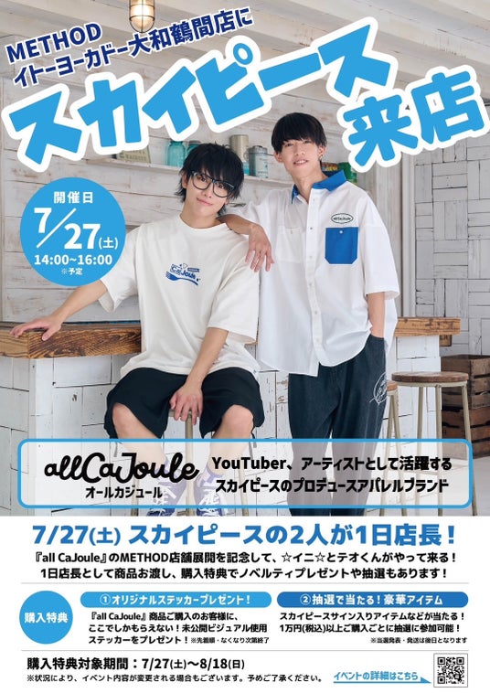 YouTuber兼アーティスト「スカイピース」が手掛けるアパレルブランド『all CaJoule(オールカジュール)』がYouTuberでは”日本初”の全国規模での常設店へアパレルブランドを展開。記念の第一弾として『METHOD イトーヨーカドー大和鶴間店』に来店。7月27日14:00~16:00(予定)に来店イベントを開催、テオくん と☆イニ☆(じん)の2人が1日店長として商品をお渡しします。