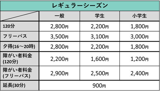 VS PARKは4種類の料金パターン(レギュラーシーズン料金・ハイシーズン料金・ベリーハイシーズン料金・スペシャルハイシーズン料金)になります。
