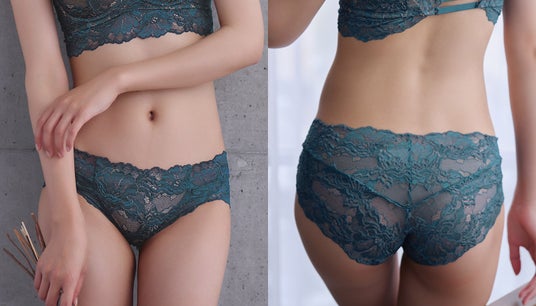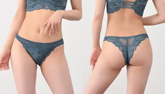 鼠径部を押さえつけない快適なカッティングにこだわり、裏地にはベージュのオーガニックコットンを使用。バックはレースのみで仕上げているためヒップをつぶさず、抜け感たっぷりのヘルシーデザインです。