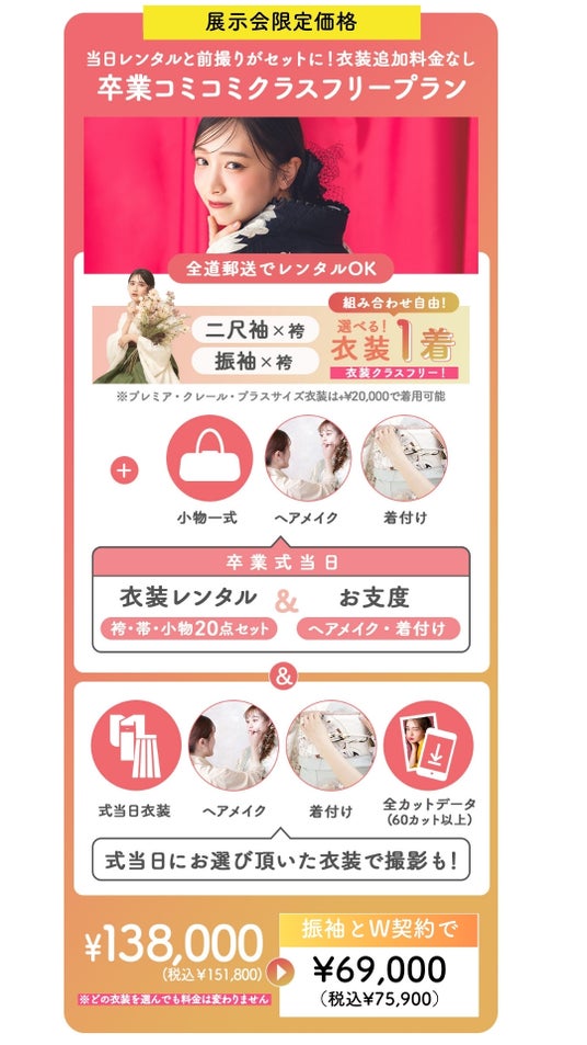 今回、振袖とのW契約で、卒業袴をどれでも選べる「クラスフリープラン」が半額になることが追加決定!式当日も、前撮りも、お任せいただける嬉しいプランが、半額の69,000円(税込75,900円)に!