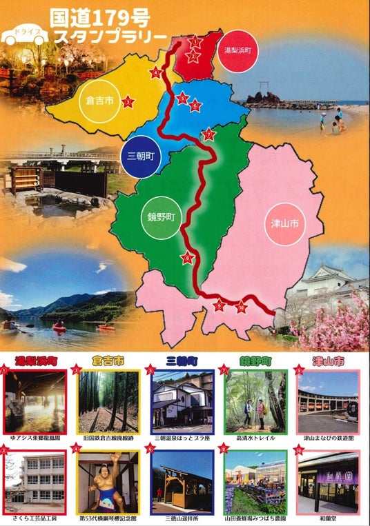 「岡山県北・鳥取中部 国道179号ドライブスタンプラリー」とは、スマートフォンを使用して国道179号で繋がる岡山県北部の「津山市」、「鏡野町」と鳥取県中部の「倉吉市」、「三朝町」(みささちょう)、「湯梨浜町」(ゆりはまちょう)にある観光地を巡るスタンプラリーです。