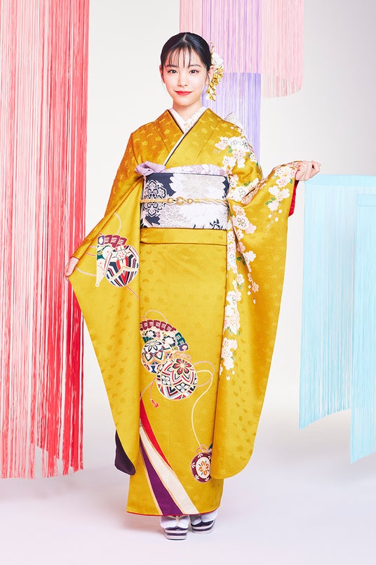 希望や幸福のモチーフである黄色に鞠や桜の柄で、華やかさの中に伝統を感じさせる振袖。ヘアはタイトにまとめ、トレンドの薄い前髪で上品かつ今っぽい雰囲気に。