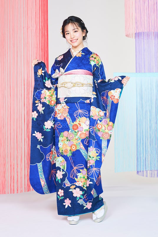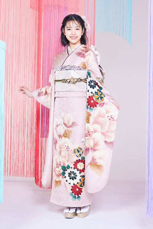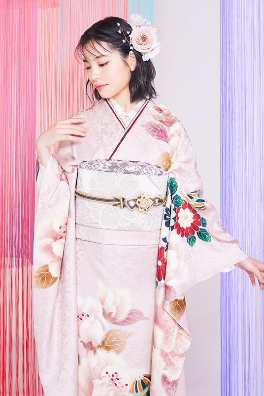 昨年から引き続き人気のくすみカラーのピンクの地色に、同系色のサクラと対照的に鮮やかな古典柄が目を引く一着。帯揚げにレースを取り入れたり、パールの付いた髪飾りなど、全体的にガーリーな最旬スタイルに。