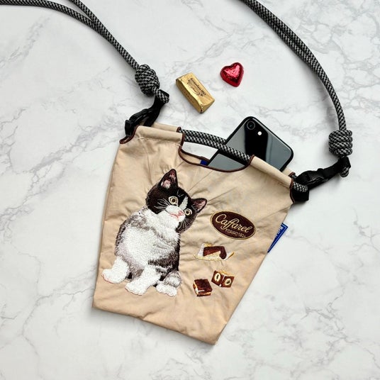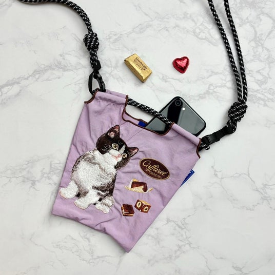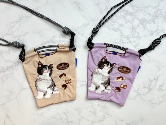 カファレルを代表するジャンドゥーヤやピエモンテといったチョコレートと愛らしいネコのアートワークが、Ball&Chainならではの精巧な刺繍で再現されています。コラボ第二弾では、ベージュとラベンダーの2色のポシェットタイプのバッグをご用意しました。夏のおでかけやアウトドアなどに嬉しいサイズ感です。